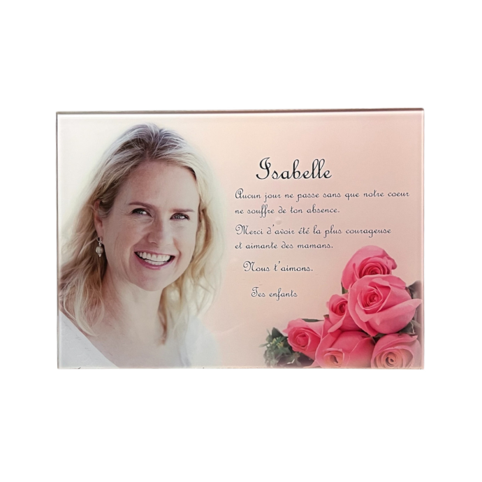 Immortaliser la mémoire d'un être cher. La gravure du visage apporte une touche intime et émouvante, offrant un hommage durable et chargé d'émotion. Réalisation sur verre sécurit